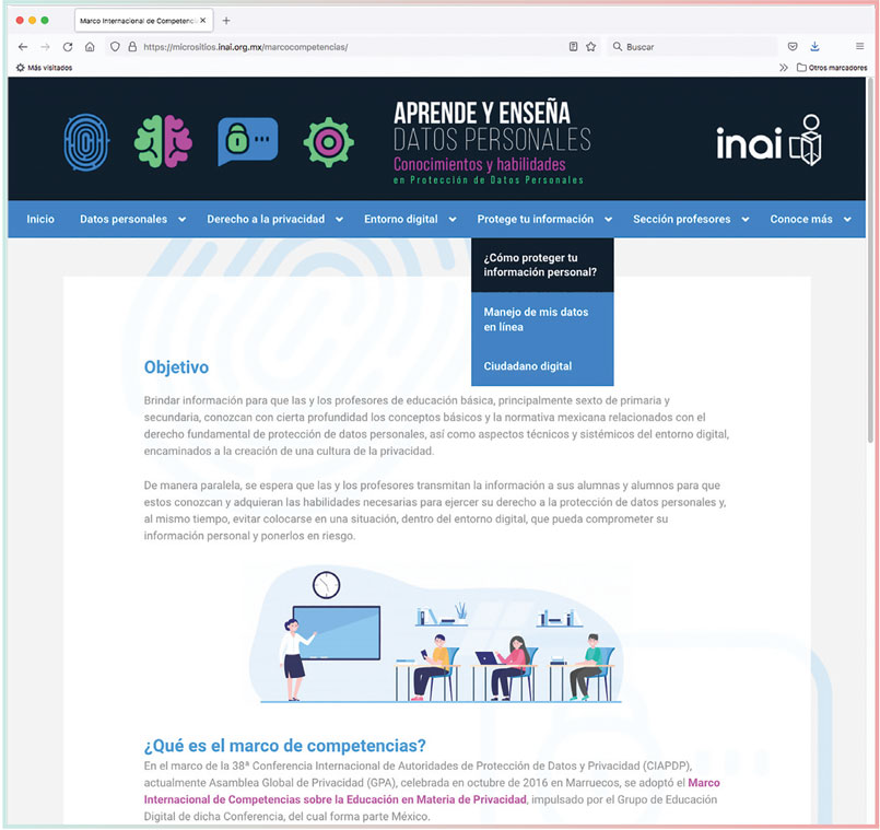 Sabemos que la educación en un país promueve su desarrollo y crecimiento y mejora la calidad de vida de todos, por lo que la alfabetización digital debe concebirse como parte de esa educación desde edades tempranas. Por ello, las instituciones educativas desempeñan un papel clave al capacitar a su personal docente para tener, entender y mantenerse al día en las habilidades digitales en las que, a su vez, deberán capacitar a sus estudiantes. En este marco, parece oportuno recomendar el acercarse a la información que brinda el INAI, institución con una importante tarea de divulgación de los derechos y responsabilidades aquí abordados. Por ejemplo, el INAI ha desarrollado gran cantidad de recursos que facilitan el entendimiento de los datos personales y que están diseñados para la población de diversos rangos de edad. Como parte de estas iniciativas, el pasado mes de julio liberaron el micrositio “Aprende y enseña datos personales: Conocimientos y habilidades en protección de datos personales”, que tiene como objetivo: Brindar información para que las y los profesores de educación básica, principalmente sexto de primaria y secundaria, conozcan con cierta profundidad los conceptos básicos y la normativa mexicana relacionados con el derecho fundamental de protección de datos personales, así como aspectos técnicos y sistémicos del entorno digital, encaminados a la creación de una cultura de la privacidad. Comparto aquí el enlace del micrositio, al que seguramente cada docente podrá sacarle gran provecho al utilizarlo como herramienta de aprendizaje y enseñanza: https://micrositios.inai. org.mx/marcocompetencias/ Ir al sitio ♦