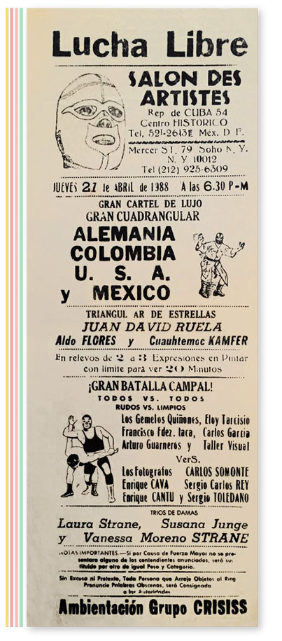 ALVARADO, Dulce María (2000). Performance en México (Historia y desarrollo). Tesis de licenciatura en Artes Visuales, UNAM. http://132.248.9.195/pd2000/278751/278751.pdf Ir al sitio BATAILLE, Georges (2008). El erotismo. Traducción de Marie Paule Sarazin. Tusquets. DEBROISE, Olivier, y Medina, Cuauhtémoc (editores) (2007). La era de la discrepancia. Arte y cultura visual en México 1968-1997. MUAC-UNAM, Turner. https://muac.unam.mx/assets/docs/la_era_de_la_discrepancia.pdf (edición de 2014, con textos de Olivier Debroise, Tatiana Falcón, Pilar García de Germenos, Vania Macías, Cuauhtémoc Medina, Lourdes Morales, Alejandro Navarrete Cortés, Álvaro Vázquez Mantecón). Ir al sitio RUIZ-RIVAS, Tomás (2006). Espacios dislocados. El Ojo Atómico: antimuseo de arte contemporáneo. SITAC V: Diálogos impertinentes, pp. 141-146. Patronato de Arte Contemporáneo. http://www.pac.org.mx/uploads/sitac/pdf/15-SITAC-V-Di%C3%A1logos-impertinentes_Tom%C3%A1s_Ruiz-Rivas.pdf Ir al sitio VÁZQUEZ, Álvaro (2013). Los Grupos: una reconsideración. La era de la discrepancia. Arte y cultura visual en México 1968-1997, pp. 196-198. MUAC-UNAM, Turner. Notas * Historiadora del arte, curadora y promotora cultural. Directora del Centro Cultural Brasil México.